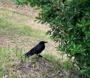ふと顔をあげると、植え込みの石崖の上にいたカラスと目があった。