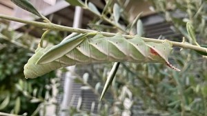 すると大きな緑の芋虫が2匹、枝にぶら下がって葉をムシャムシャ。