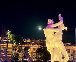 夕日に浮かぶシルエット、はるか向こうに大屋根リングをそぞろ歩く人々の点々がつらなっている。