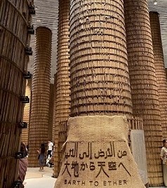 ナツメヤシの幹が林立する、野趣と洗練が融合したパビリオン。祈りと共に日々の営みがある漁師の映像に静かな感動を覚える。