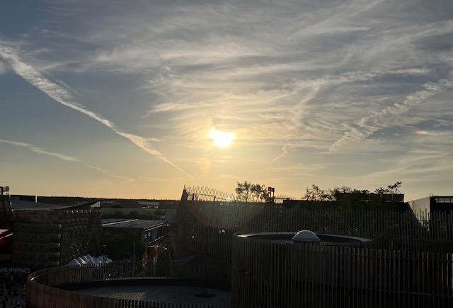 夕日に浮かぶシルエット、はるか向こうに大屋根リングをそぞろ歩く人々の点々がつらなっている。